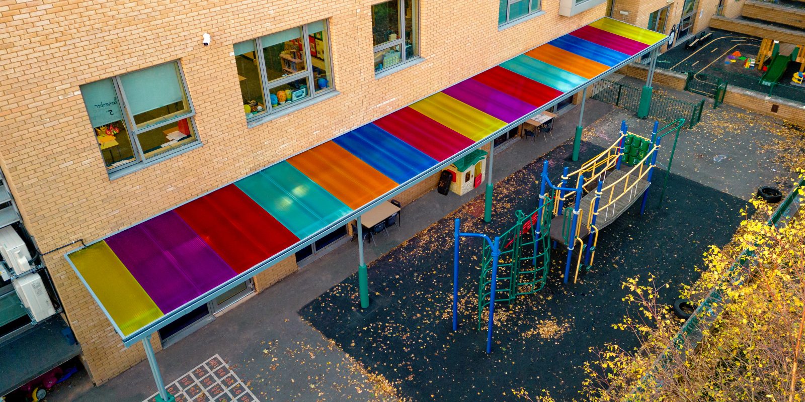 The canopies looked marvellous against the existing buildings of the school grounds, giving the outdoor areas a vibrant upgrade. The colourful polycarbonate roof sheets allow for a high percentage of light transmission to create a vivid pattern on the floor, which are particularly enjoyed by the primary children who are fascinated with the colours. The canopy structures really help to create a fun and exciting learning environment for all ages, enhancing their learning experience.