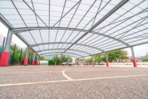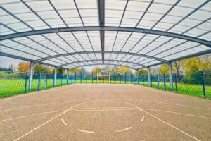 The Mawney Foundation School wanted their pupils to enjoy sports outside, even when it rained. Their sports pitch needed a roof to keep everyone dry and safe throughout the year. And so they approached school shelter experts A&S Landscape to help.We went ahead to design a 32m x 16m custom-covered MUGA™canopy that fits the pitch perfectly. It had a strong galvanised frame and an Opal polycarbonate roof that let in light but kept out the rain. The design importantly also gave pupils shelter during playtime.Now, the school has a safe and fun space that works in all weathers. So, they no longer had to cancel sports sessions when it rained. Read the details about the project here.