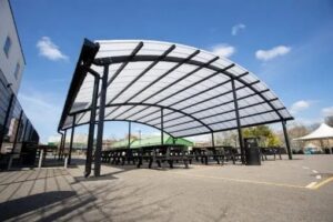 The secondary school took the decision to radically change its dining provision with the installation of four canopy covers. Amongst their aims and ethos, the school promotes a safe and healthy lifestyle for all of its students. The desire to improve dining facilities formed part of these aims, and they started to explore options after contacting us.