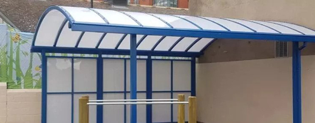 The overall result can be seen for itself, a large door shelter with bespoke design features in the rainbow-effect roof panels. Providing a practical shelter against the elements for those coming into school. Plus, the shelter also gives provides additional playground space for outdoor play and learning.