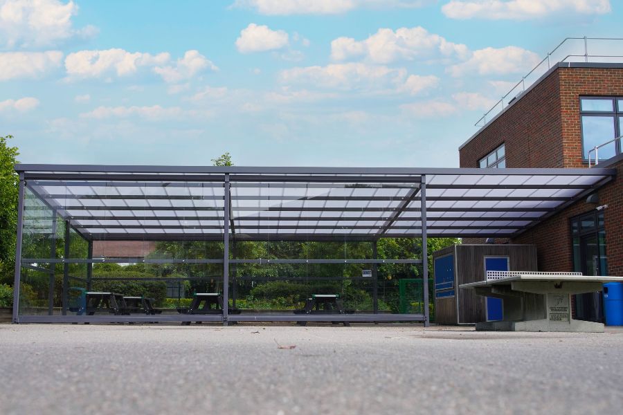 The ‘Linear’ is our monopitch (asymmetric) straight roof variant - this is where one side is higher than the other, the standard configuration for canopies located against building elevations but also used for many applications including walkways and outdoor dining areas. Widths of 10000mm are easily achieved and wider still with additional design features.