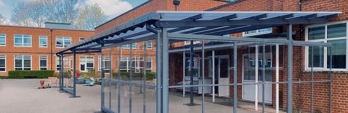 We supplied the school with two different canopy designs, we installed a large Motiva Duo™ at the front of the school – which was enclosed with glass sides. Then at the rear of the school, we installed an even larger enclosed Motiva Linear™ canopy including both heating and lighting options – allowing the students to comfortably use the canopy all year round. Both canopies made use of a Slate Grey Duracoat™ on all steelwork, combined with our popular Opal roof – that amplifies light into the area. The finished canopies are both modern and built to last, so the school can take advantage of these Exceptional Covered Spaces™ for many years to come.