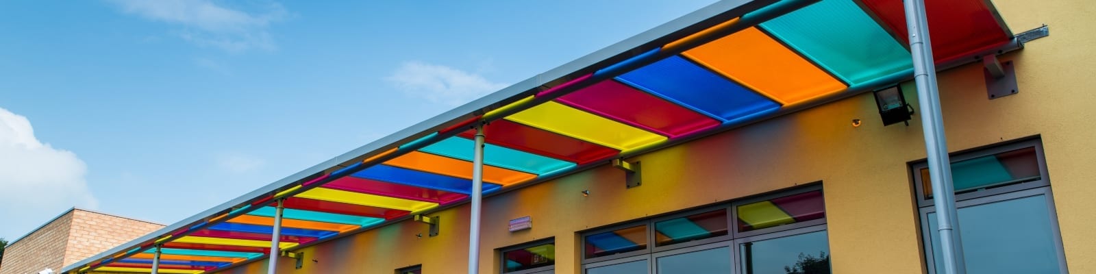 We built a straight polycarbonate roof canopy in William Gilbert CE Endowed Primary School Duffield, Belper, Derbyshire. The job involved the supply and installation of one Motiva™ monopitch straight roof canopy measuring 5900mm X 4700mm and included for our Alu-Tuff™ aluminium box profile guttering and downpipes which were coated in a matching Dura-coat™ colour finish.