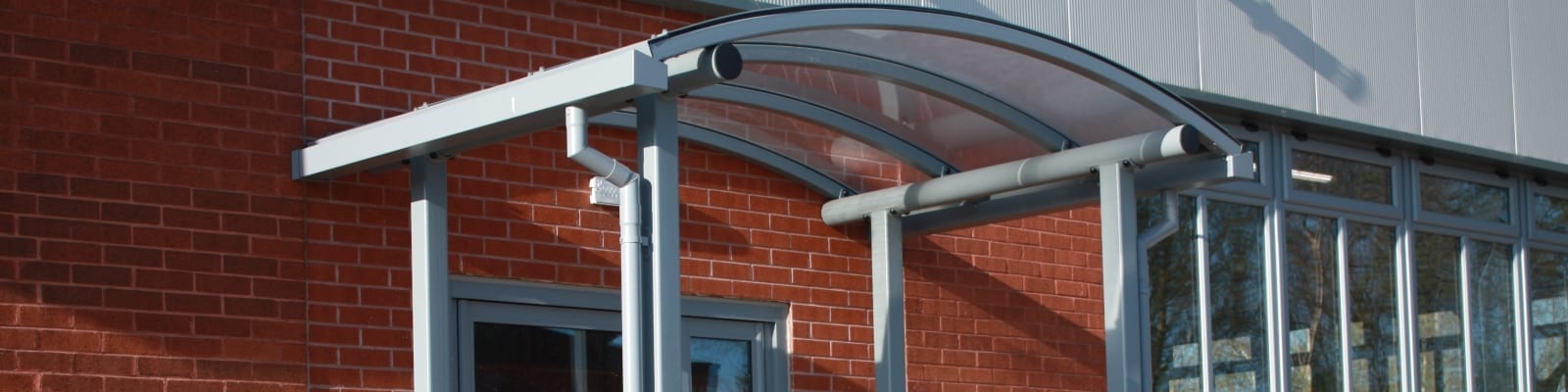We created a curved roof canopy for Congleton High School, Box Lane, Congleton, Cheshire. The job involved one Motiva™ Duo duopitch curved roof canopy measuring 11000mm X 6000mm and included for our Alu-Tuff™ aluminium box profile guttering and downpipes in matching Dura-coat™ colour finish.