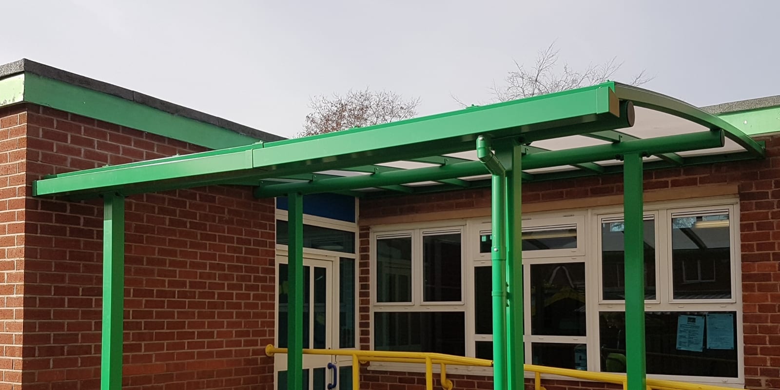 In collaboration with a specialist firm of architects A&S created a curved roof canopy in Pinchbeck East C Of E Primary School Pinchbeck , Spalding, Lincolnshire. The full contract involved one Motiva™ Mono curved roof canopy measuring 9137mm X 3000mm with Alu-Tuff™ aluminium box profile guttering and downpipes coated in a matching Dura-coat™ colour finish with glazed panels to side elevations.