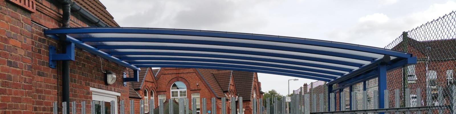 Working alongside a leading architect our team designed a straight polycarbonate roof canopy and a DryMuga™ canopy for Zaytouna Primary School, Derby, Derbyshire. The job involved one Motiva™ Cantilever straight roof canopy measuring 21900mm X 4000mm and included for our Alu-Tuff™ aluminium box profile guttering and downpipes in matching Dura-coat™ colour finish. Also a galvanised finish Motiva™ DryMuga™ duopitch curved opal polycarbonate roof structure measuring 31600mm X 17200mm including for guttering and downpipes.