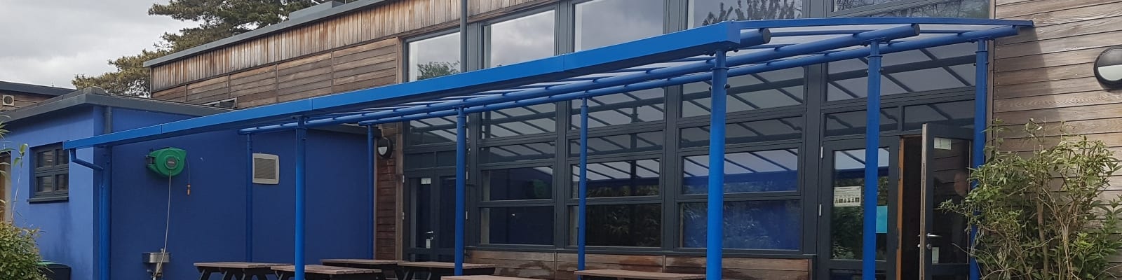 We designed a straight polycarbonate roof canopy in Hythe Primary School, Hythe, Kent. The contract included the supply and installation of one Motiva™ monopitch straight roof canopy measuring 8000mm X 4000mm and included for our Alu-Tuff™ aluminium box profile guttering and downpipes in matching Dura-coat™ colour finish.