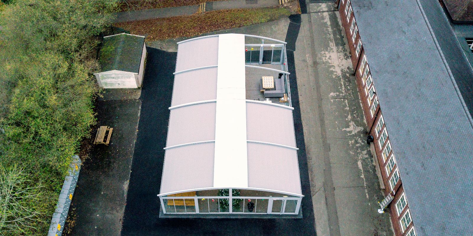 Kingsmead School in Hednesford, Staffordshire wanted to find an outdoor dining shelter that could revolutionise its outdoor space and reduce pressure on its existing facilities. They were searching for something impressive and out of the ordinary – a fully enclosed canopy with a retractable roof as well as heating and lighting, so it could be used throughout the year by the entire student population. The staff also thought that the perfect shelter would have multiple doors for easy access, plus a sleek design that let in lots of light and would make a real difference to the school experience.
