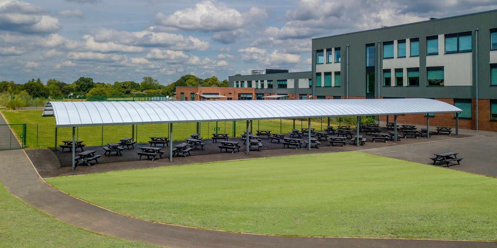 Following talks about what they wanted from the shelter and the options they could consider, Laurus Cheadle Hulme selected our Motiva Duo™. This was an excellent choice as it’s ideal for outdoor dining areas – as well as many other applications like playground shelters – and its attractive, symmetric curved roof had the ‘wow’ factor the school was looking for. We built the canopy to measure a massive 40000mm X 10000mm, making it one of our largest Motiva Duo™ models ever! This meant there was more than enough space at break times for students and teachers alike to eat lunch, talk with friends, or relax with some music. The rain now wouldn’t stop anyone from enjoying this time outside, thanks to the genuine, Opal polycarbonate roofing which we installed along with Basalt Grey steelwork. The design complemented the buildings and didn’t detract from the open spaces, while also undeniably forming an impressive structure within itself.