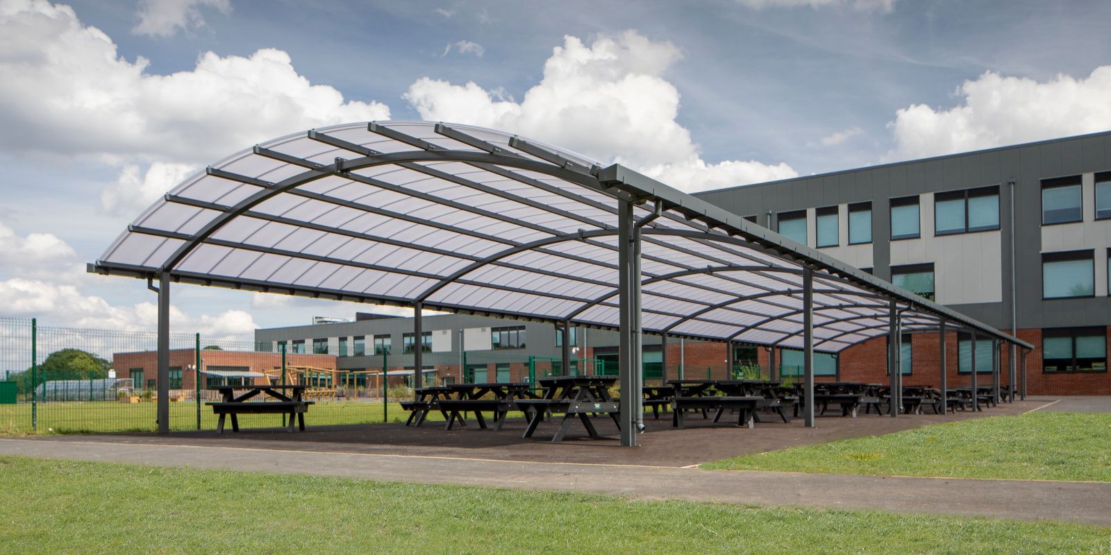 Our canopies with curved roofs are a favourite of many of our customers, such as academies and universities. Not only do they have aesthetic appeal with their artistic, sweeping curves that bring interest to any outdoor space, but they are also very versatile. They can easily be used as everything from dining shelters to places for outdoor play and learning. What’s more, they can come in duopitch (symmetric) or monopitch (asymmetric) designs and can be installed as freestanding or lean-to structures, so they can work to any customer’s or building’s requirements.