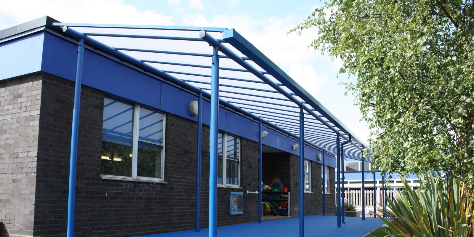 Working with our contractor client we designed a straight polycarbonate roof canopy with side panels at Jesson’s Church Of England Primary School, School Street, Dudley, West Midlands. The contract included the supply and installation of one Motiva™ monopitch straight roof canopy with Alu-Tuff™ aluminium box profile guttering and downpipes which were coated in a matching Dura-coat™ colour finish and installation of glazed panels to side elevations.