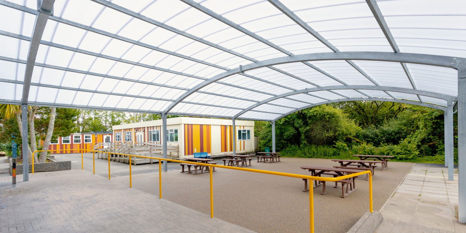 The dining and events canopy has been really well-received. The multi-purpose space met the school’s brief and students can enjoy concerts and lunchtimes in the fresh air at any point in the year, even if the weather isn’t up to scratch. The curved roof easily keeps out the rain and wind so everyone can get the most out of their brand new facility, and we enjoyed adapting our model to work with Mounts Bay Academy’s requirements. We hope that they will use the shelter to help many children have even more fun at their concerts and break times.
