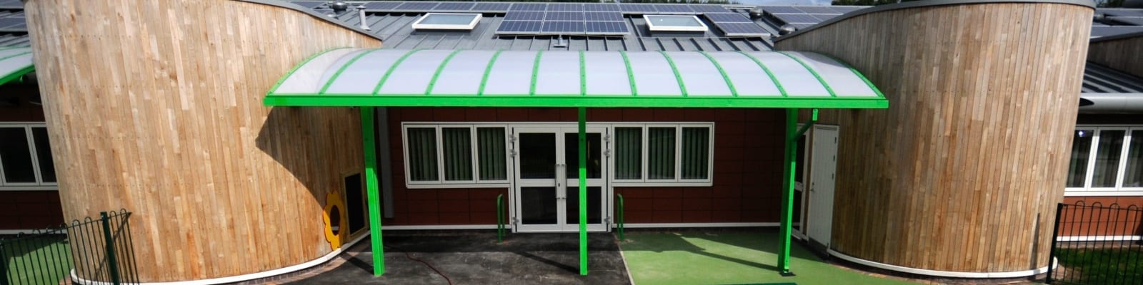 In collaboration with our building contractor client we built a straight polycarbonate roof canopy in Lynncroft / Lawrence View Primary School, Walker Street, Eastwood, Nottingham. The job involved the supply and installation of one Motiva™ monopitch straight roof canopy measuring 17500mm X 2400mm with Alu-Tuff™ aluminium box profile guttering and downpipes in matching Dura-coat™ colour finish.