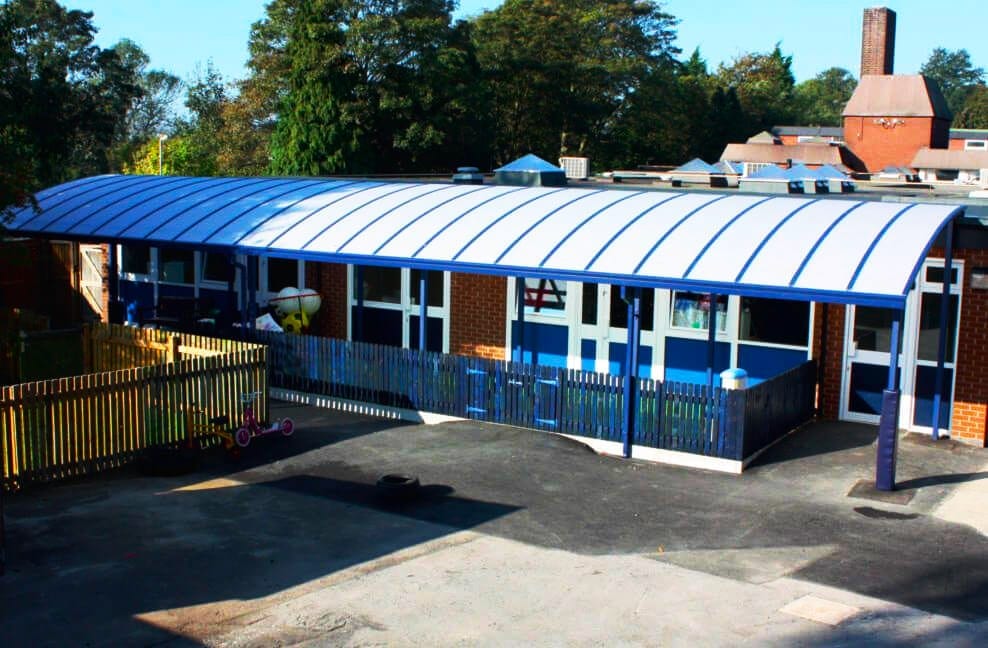 Blue Straight Roof Play Area Canopy Fitted at Captain Webb Primary School