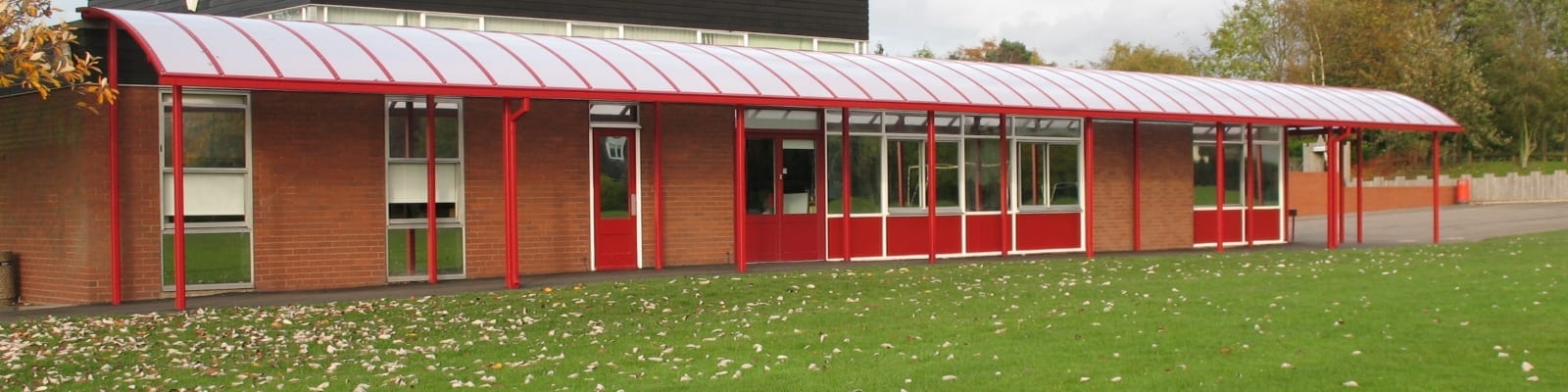 Working with our building contractor client our engineers built a straight polycarbonate roof and two cantilever canopies at Weeton County Primary School Grantham Road, Weeton With Preese, Preston. The contract included the supply and installation of three canopies. One Motiva™ monopitch straight roof canopy measuring 33700mm X 4000mm including for specialist roofing detail. One Motiva™ Cantilever curved roof canopy measuring 4200mm X 2000mm and one Motiva™ Cantilever curved roof canopy measuring 2870mm X 2000mm. All canopies included for our Alu-Tuff™ aluminium box profile guttering and downpipes which were coated in a matching Dura-coat™ colour finish.