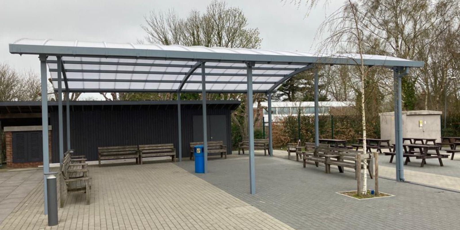 After discussing several excellent products with the helpful team at A&S Landscape, Poltair School decided that the Motiva Duo™ could be adapted to create their ideal custom canopy. Built to specifications of 10000mm X 10000mm, it offered enough space for many students to enjoy eating and socialising while freeing up space in the other facilities. The Motiva Duo™ was a fantastic choice for a dining shelter, thanks to its duopitch (symmetric) roof which suits standalone structures. The curved design was both attractive and practical and, combined with side panels, would protect everyone beneath it from all weathers in all seasons. Plus, staff chose Brown Red steelwork, Slate Grey guttering and an Opal polycarbonate roof to give their new canopy a striking, modern feel.