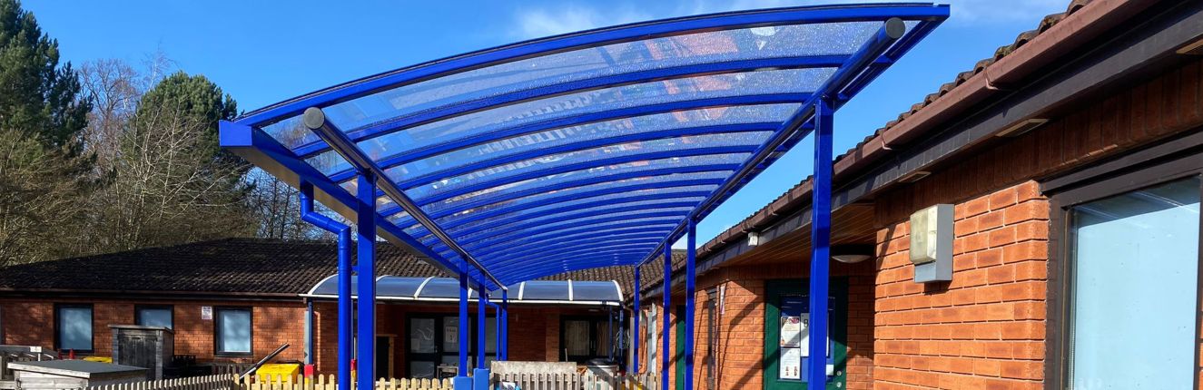 Our team erected a straight polycarbonate roof canopy in Saddleworth School, Uppermill, Oldham, Greater Manchester. The job involved the supply and installation of one Motiva™ monopitch straight roof canopy measuring 11000mm X 9000mm with Alu-Tuff™ aluminium box profile guttering and downpipes in matching Dura-coat™ colour finish the supply and fitting of one Maxima™ waterproof Umbrella structure supported on a single upright measuring 5000mm X 5000mm.