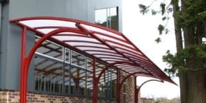 In combination with a specialist firm of architects A&S produced a straight polycarbonate roof canopy at Hollinswood Primary School, Telford, Shropshire. The full contract involved one Motiva™ monopitch straight roof canopy measuring 12000mm X 11000mm including Alu-Tuff™ aluminium box profile guttering and downpipes in matching Dura-coat™ colour finish. Also the supply and installation of one glazed panel from the top of the existing building to the top of the canopy.