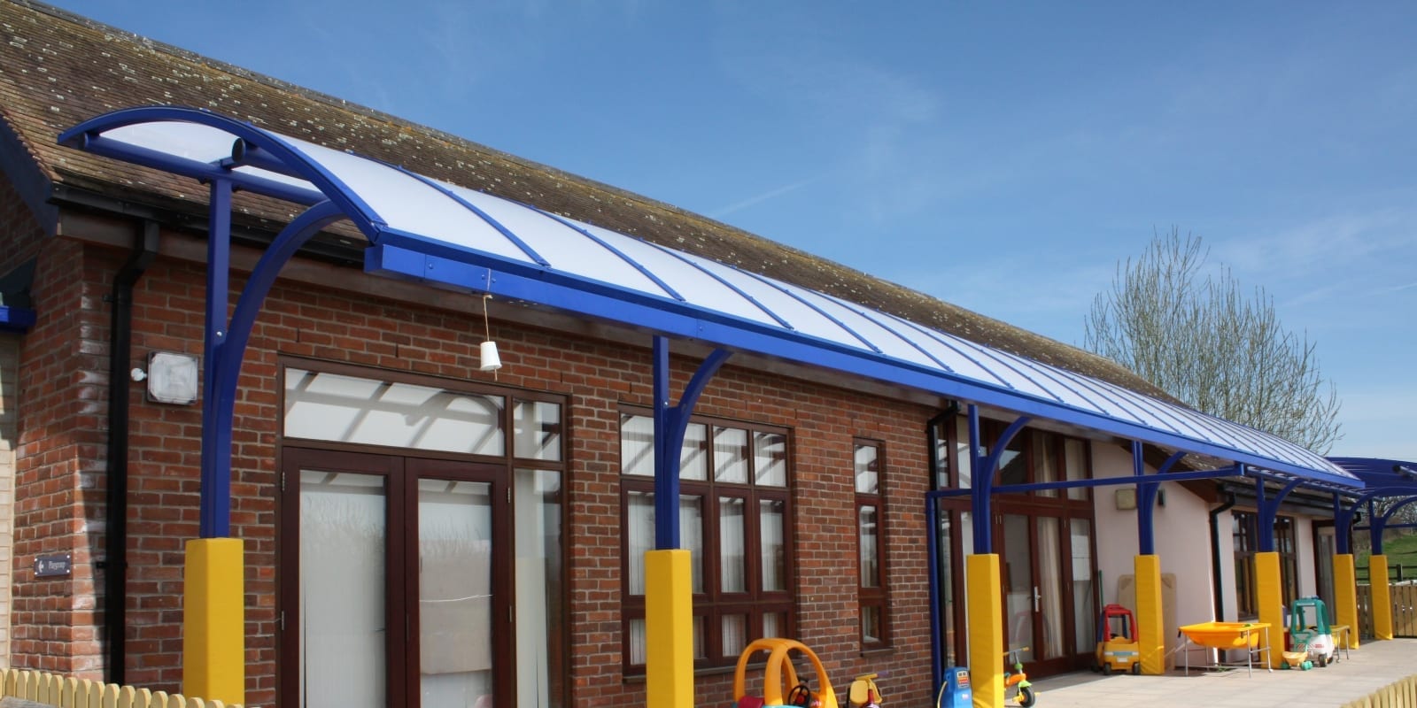 Our engineers erected a straight polycarbonate roof canopy at Little Learners Day Nursery Purley, Croydon, London. The full contract involved the supply and installation of one Motiva™ monopitch straight pitched roof canopy measuring 12150mm X 3000mm and 10150mm x 3000mm and post protector pads.