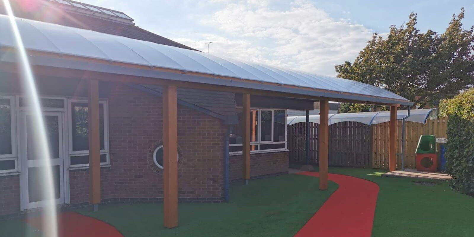 Working alongside our building contractor client we erected a straight polycarbonate roof canopy at High Hazel Academy, Sheffield, South Yorkshire. The contract included the supply and installation of one Motiva™ monopitch straight roof canopy measuring 14400mm X 5800mm and included for our Alu-Tuff™ aluminium box profile guttering and downpipes in matching Dura-coat™ colour finish.