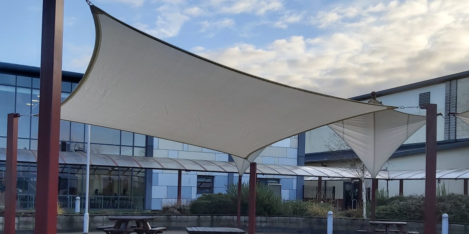Our engineers constructed a waterproof sail structure in Shipley College Shipley, West Yorkshire. The contract included the supply and installation of one Maxima™ tensile waterproof fabric sail structure comprising of two sails on five uprights and one wall bracket including for all stainless steel fixtures and fittings.