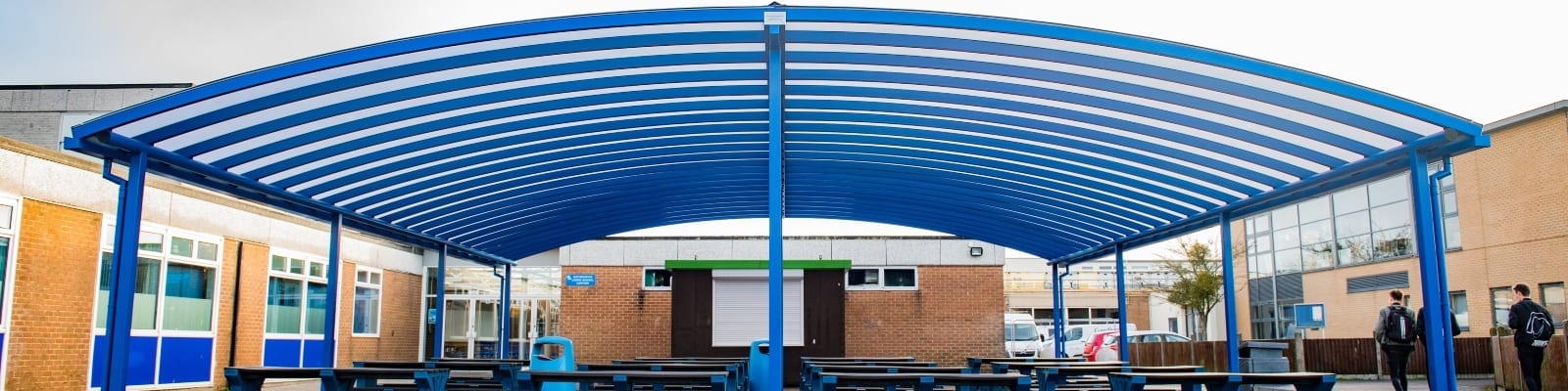 A&S designed a curved roof canopy in Hawksworth CE Primary School Main Street, Leeds, Yorkshire. The full contract involved one Motiva Duo™ duopitch curved roof canopy measuring 6100mm X 6000mm with Alu-Tuff™ aluminium box profile guttering and downpipes in matching Dura-coat™ colour finish.