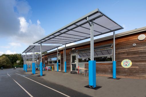 Following talks about what they required from us and the new structures, Ysgol Ty Ffynnon chose our Motiva Linear™. This is a popular model as it has a robust build and straight roof that easily keeps out the unpredictable British weather, and it has a Dura-coat™ finish that allows it to look fantastic for many years. We installed Squirrel Grey steelwork and Opal polycarbonate roofs that looked sleek and subtle, making for six identical canopies that could do their job beautifully while not detracting from the look of the building. They all measured 5900mm X 4000mm which was just the right size for multiple groups of pupils to play, eat or relax underneath them. What’s more, we added 24 post protector pads to ensure safety was the top priority.